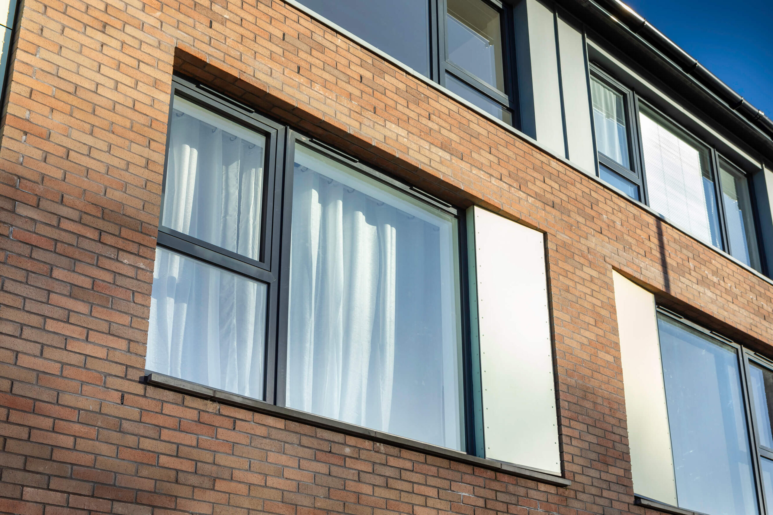 Flush Tilt & Turn Windows with a dark aluminum frame, perfectly complementing a brick facade.