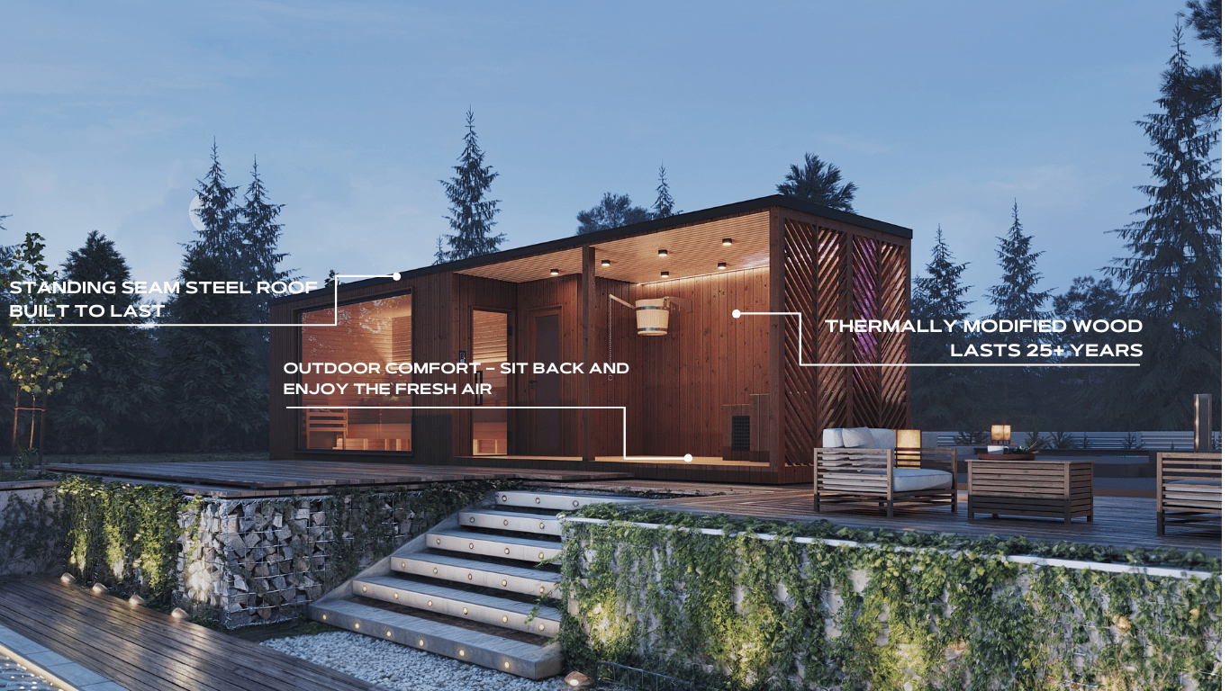 As manufacturers we can expand, adjust and customize your sauna in any direction, adding terraces, covered canopies, shower areas, changing rooms, bar zones, BBQ setups, relaxation spaces or storage modules, creating the perfect layout for your property and the way you live. For a complete wellness experience you can also pair your sauna with one of our premium ice baths for contrast therapy and deeper recovery.