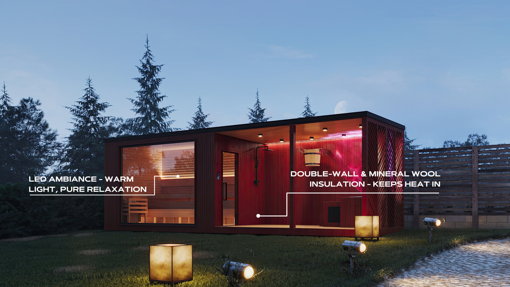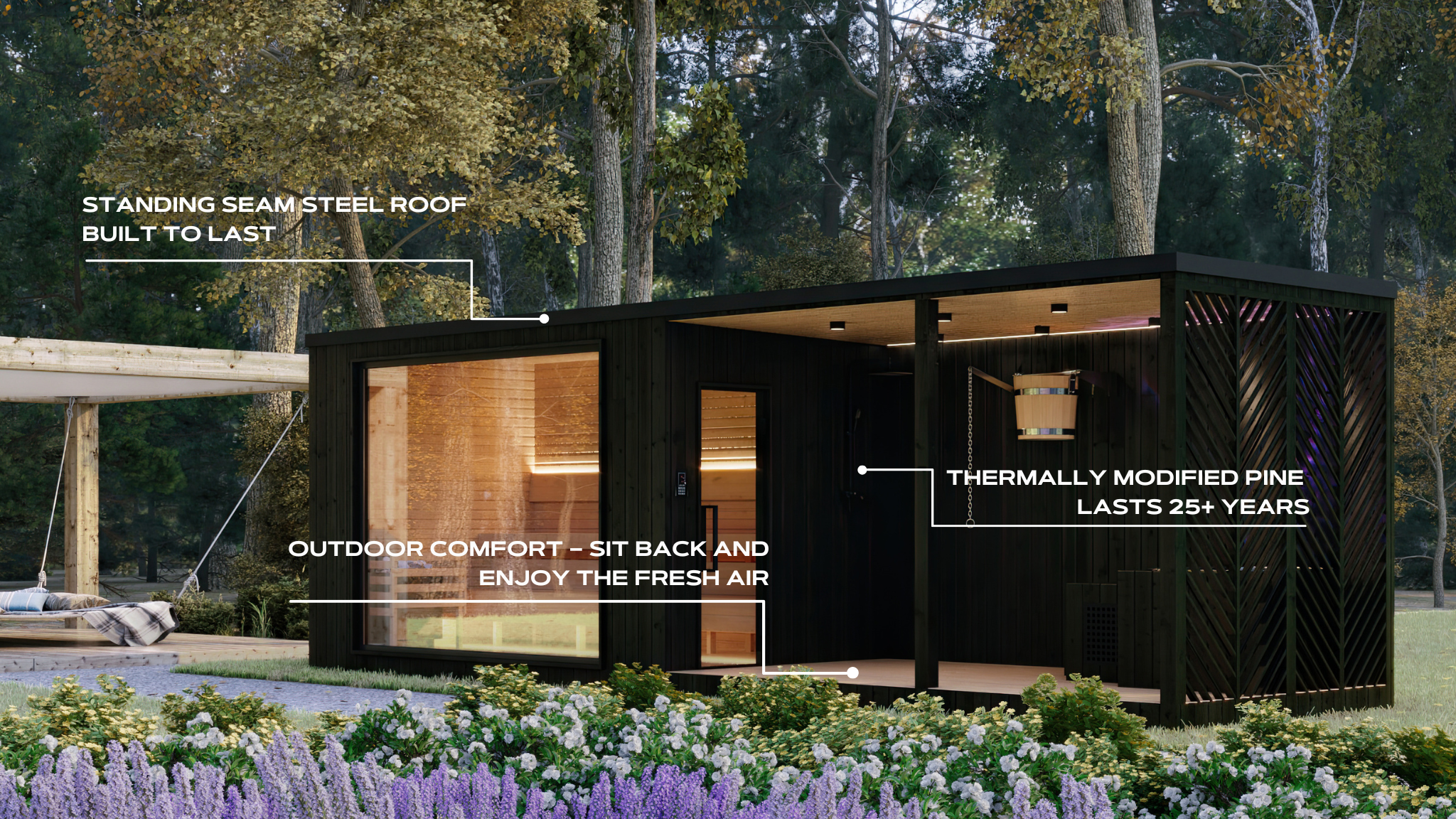 As manufacturers we can expand, adjust and customize your sauna in any direction, adding terraces, covered canopies, shower areas, changing rooms, bar zones, BBQ setups, relaxation spaces or storage modules, creating the perfect layout for your property and the way you live. For a complete wellness experience you can also pair your sauna with one of our premium ice baths for contrast therapy and deeper recovery.
