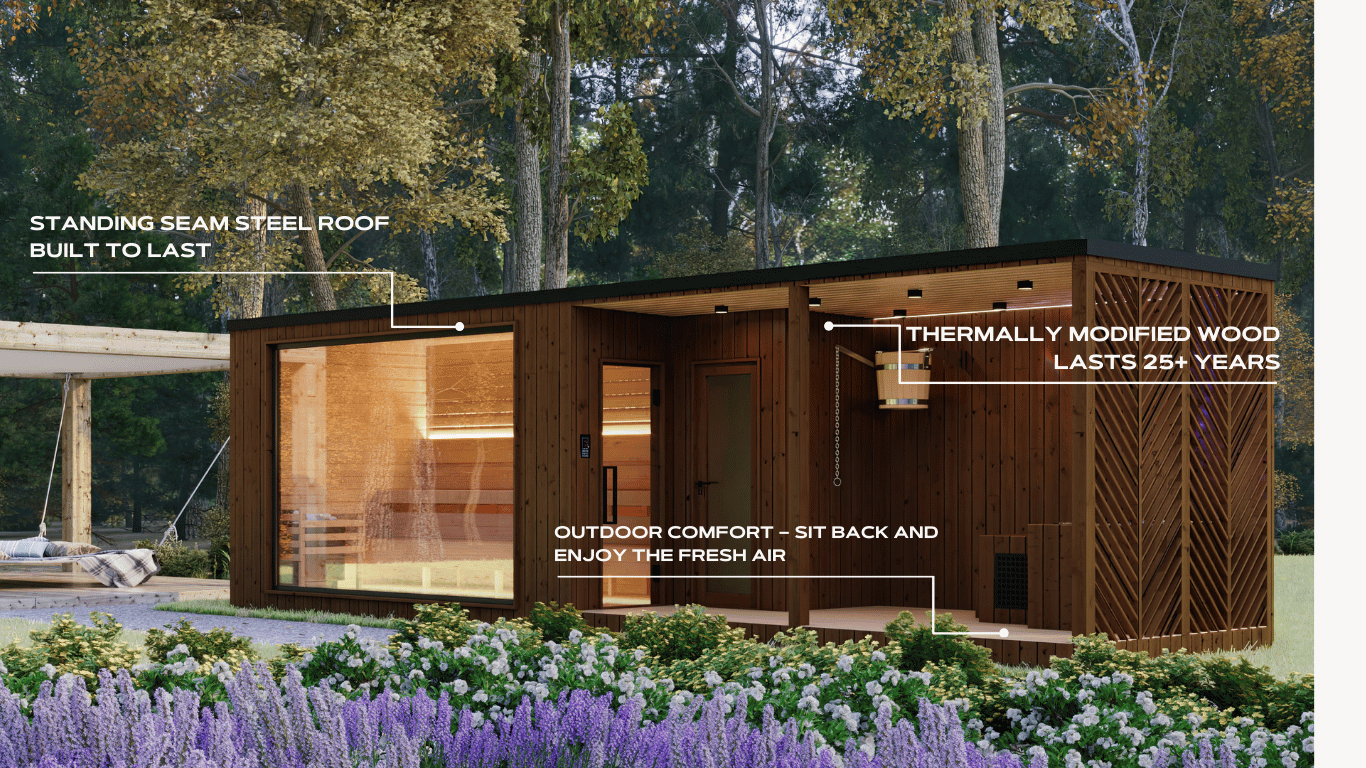 As manufacturers we can expand, adjust and customize your sauna in any direction, adding terraces, covered canopies, shower areas, changing rooms, bar zones, BBQ setups, relaxation spaces or storage modules, creating the perfect layout for your property and the way you live. For a complete wellness experience you can also pair your sauna with one of our premium ice baths for contrast therapy and deeper recovery.