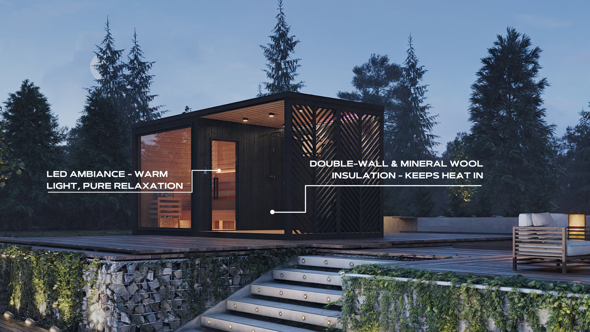 Each sauna features a large double-glazed panoramic window that fills the interior with natural light, opens the view to your garden, and makes the space feel more open, relaxing, and connected to nature. The insulated glazing keeps the heat inside while giving the sauna its modern, airy look.